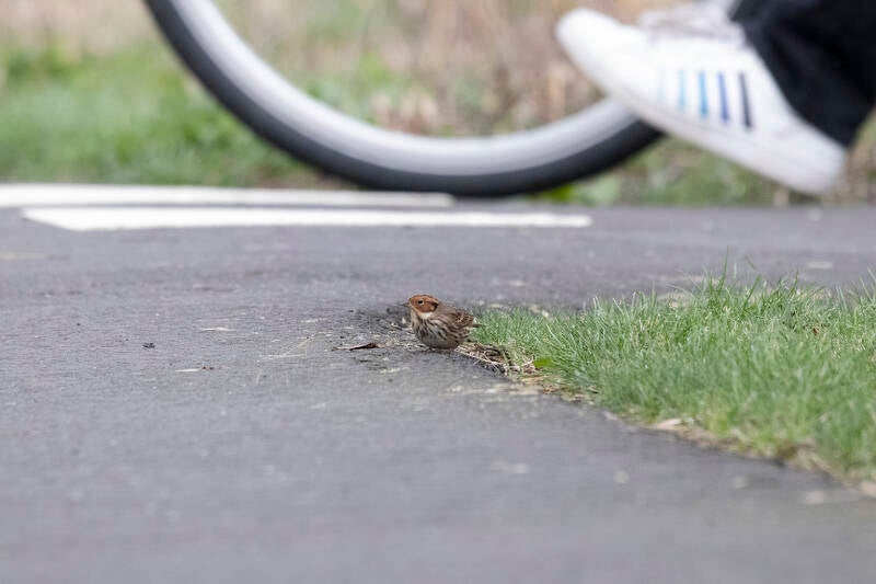 Ver te lopen hoefden we niet, want de vogel zat inderdaad strak tussen fietspad en restaurant zijn kostje bij elkaar te scharrelen, maar matig geïnteresseerd in de passerende fietsers en wandelaars. Open en bloot, zoals de eerdere commentaren vorige week hadden doen verwachten. Zo erg zelfs, dat het voor mij ook een fotomoment was, al moest ik daarbij wel steeds om de aardige fotograaf die steeds voor mij uit kroop heenwerken.